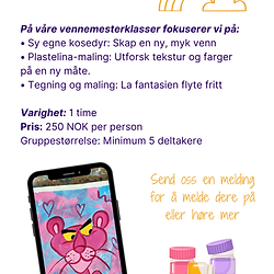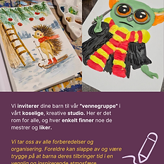 Vi vet at tilpasning til nye omgivelser kan være utfordrende for barn. Derfor er det så viktig å finne et trygt og spennende sted hvor de kan ha det gøy, utfolde seg kreativt og finne nye venner. Art Lab tar seg av dette og hjelper foreldre med å organisere aktiviteten. Vi inviterer dine barn til vår "vennegruppe" i vårt koselige, kreative studio. Her er det rom for alle, og hver enkelt finner noe de mestrer og liker. Vi tar oss av alle forberedelser og organisering. Foreldre kan slappe av og være trygge på at barna deres tilbringer tid i en vennlig og inspirerende atmosfære. På våre vennemesterklasser fokuserer vi på: 🧵 Sy egne kosedyr: Skap en ny, myk venn 🎨 Plastelina-maling: Utforsk tekstur og farger på en ny måte. 🖌️ Tegning og maling: La fantasien flyte fritt Detaljene: ⏰ Varighet: 1 time 💰 Pris: 250 NOK per person 👥 Gruppestørrelse: Minimum 5 deltakere Og allerede første samling vil finne sted mandag 10. november, kl. 17:30–18:30, i den koselige atmosfæren i ArtLab-studioet 🎨